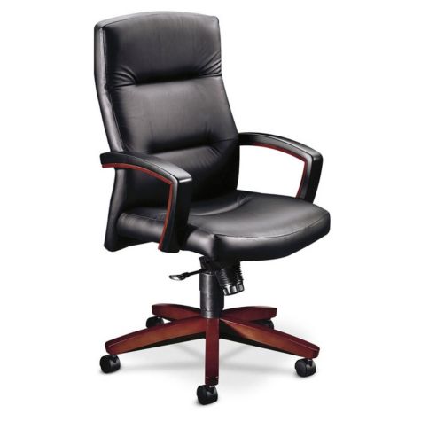 High Back Leather Executive Chair W Wood Arms Officechairs Com : An Elegant High Back Leather Office Chair With Wooden Arms And Wooden Five Star Base With Castors.