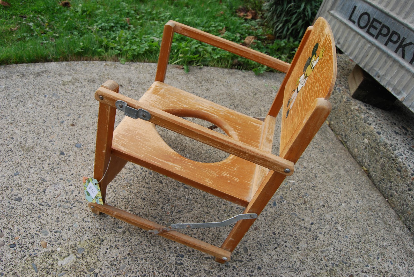 Rust Belt Revival Online Auctions. The tray is released and lifts up. All original antique wood potty chair with a lamb decal motif. This is a wooden antique potty chair with a tray. Folding wooden potty chair with tray made by nuline. The actual potty is missing. There is a round wood cover that is removed revealing a hole converting it into a potty chair. Used and owned by bill boyd in the 1950s. Encompassing toys, books, clothing and other items, the william boyd childhood collection is rare in its comprehensiveness: Tough to find this one! As found untouched and probably in need of some gluing.